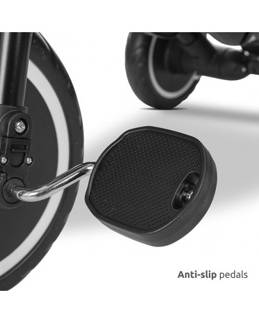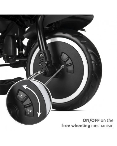 La seguridad está garantizada con su cinturón de seguridad, barra de protección desmontable y pedales antideslizantes. Además, el sistema de rueda libre permite que el niño pedalee sin mover el triciclo hasta que esté listo para hacerlo por sí mismo.