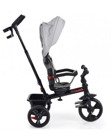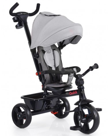 Triciclo infantil evolutivo QUICK de Byox, apto para niños desde los 12 meses de edad hasta los 25 kilos de peso. Con grandes ruedas para facilitar la conducción y asiento reversible para mirar en los dos sentidos de la marcha.
